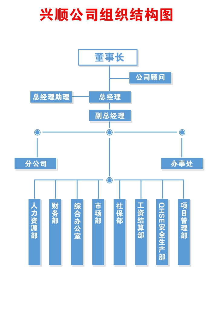 公司下設(shè)有:四川興順勞務(wù)代理有限公司成都分公司、四川興順勞務(wù)代理有限公司物業(yè)服務(wù)分公司、敘永辦事處、貴陽辦事處、云南辦事處、廣西辦事處、德陽辦事處、百色辦事處、赤水辦事處、川中公管中心南充辦事處;四川金帆建筑勞務(wù)有限公司各工程項(xiàng)目部。公司內(nèi)設(shè)有:公司辦公室、財(cái)務(wù)部、人力資源部、市場部、外包業(yè)務(wù)管理部、QHSE安全生產(chǎn)部、工資及社會保險(xiǎn)管理部、顧問辦公室等職能部門。